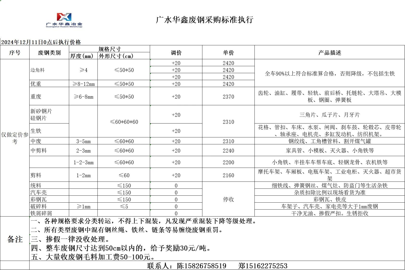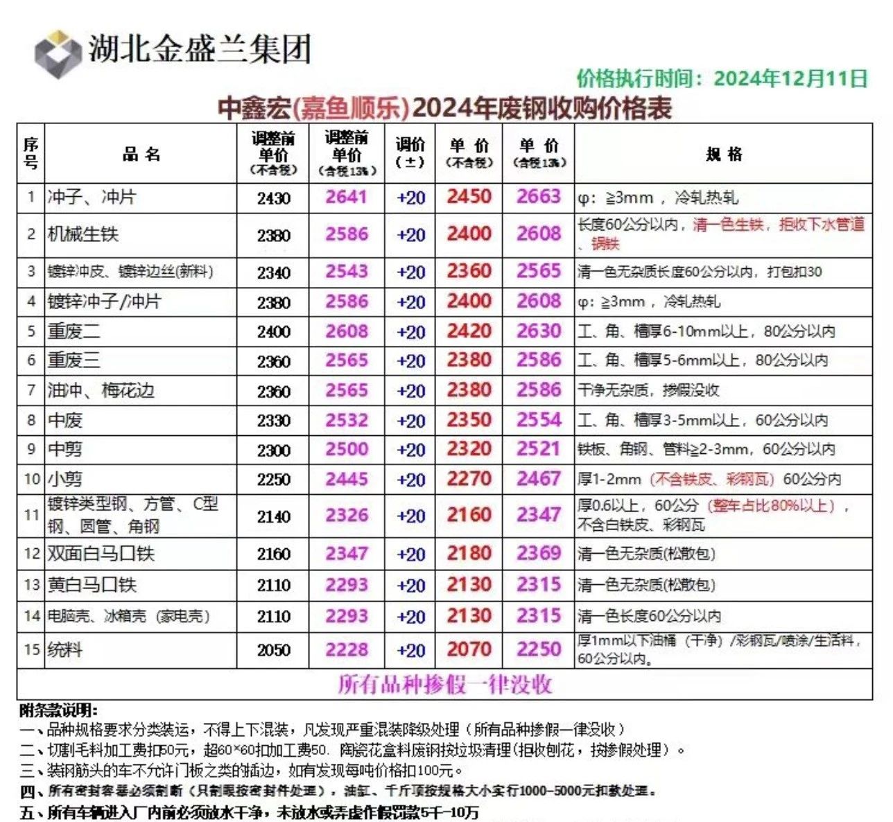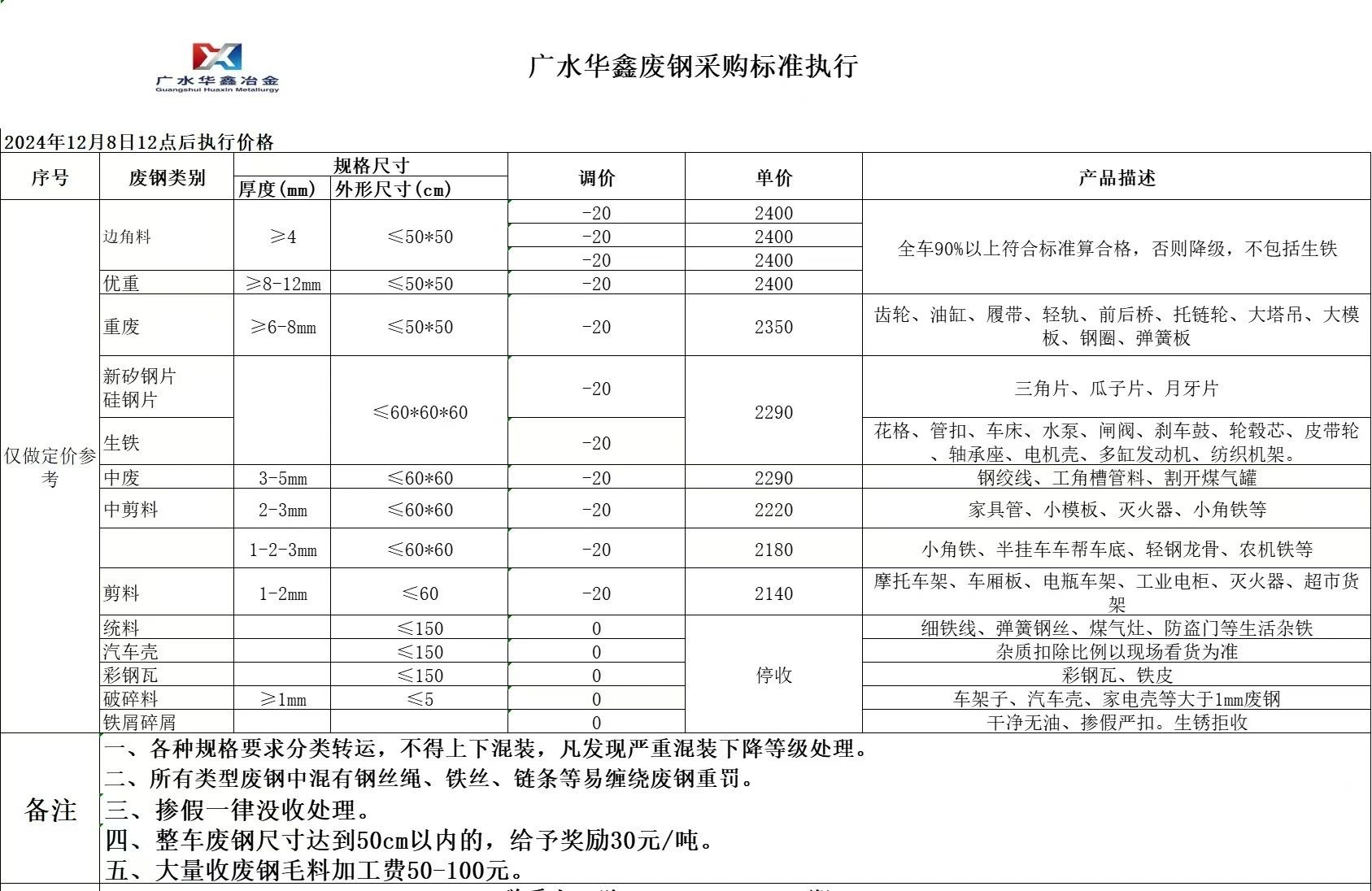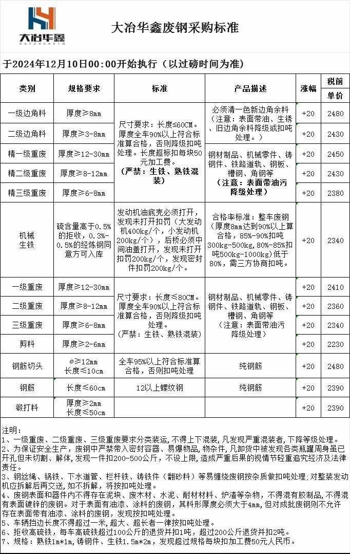 湖北广水华鑫下午废钢下调**,具体以价格表为准