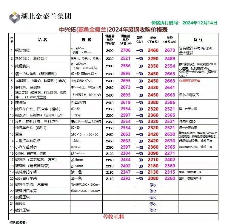 **日湖北嘉鱼金盛兰跌**最新,钢筋切粒****,新矽钢片、新硅钢片****,纯钢筋头****,清一色边角料(新钢板料)****,火车配件、火车轮、轨道钢(*米内)****,锻打料、马蹄铁****,精品废钢(模具钢、料头园钢、报废件)、***mm厚重废****,酸洗板****,纯汽车白铁、汽冲件(镀锌)****,钢筋压块、新钢板料(边角料)压块****,冷轧、热轧压块、新料边丝****,纯汽车白铁(**铝)****,重废一****,大型汽车前后桥****,小汽车前后桥****,C型钢、镀锌管、方管****,破碎料(建筑模板、方管)****,破碎料(建筑圆钢管)****,破碎摩托车架****,破碎自行车架****,不含税
