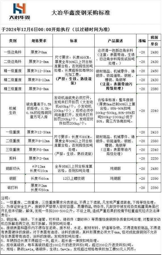 大冶华鑫通知,****年**月**日开始,所有品种废钢价格跌**元/吨,标准明天补发