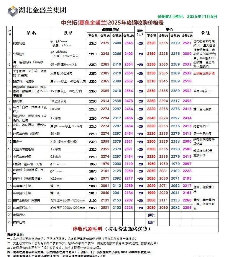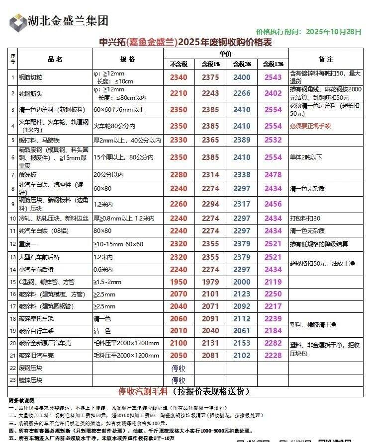 **日湖北中兴拓(嘉鱼金盛兰)废钢跌**:钢筋切粒****纯钢筋头****,清一色边角料****,火车配件、火车轮、轨道钢.(*米内)****,锻打料、马蹄铁、红冲料****精品废钢****,酸洗板****,纯汽车白铁、汽冲件(镀锌)****新钢板料压块、钢筋压块****冷轧、热轧压块、新料边丝****纯汽车白铁(**铝)****重废一****、大型汽车前后桥****小汽车前后桥****,链锌压块停收不含税。