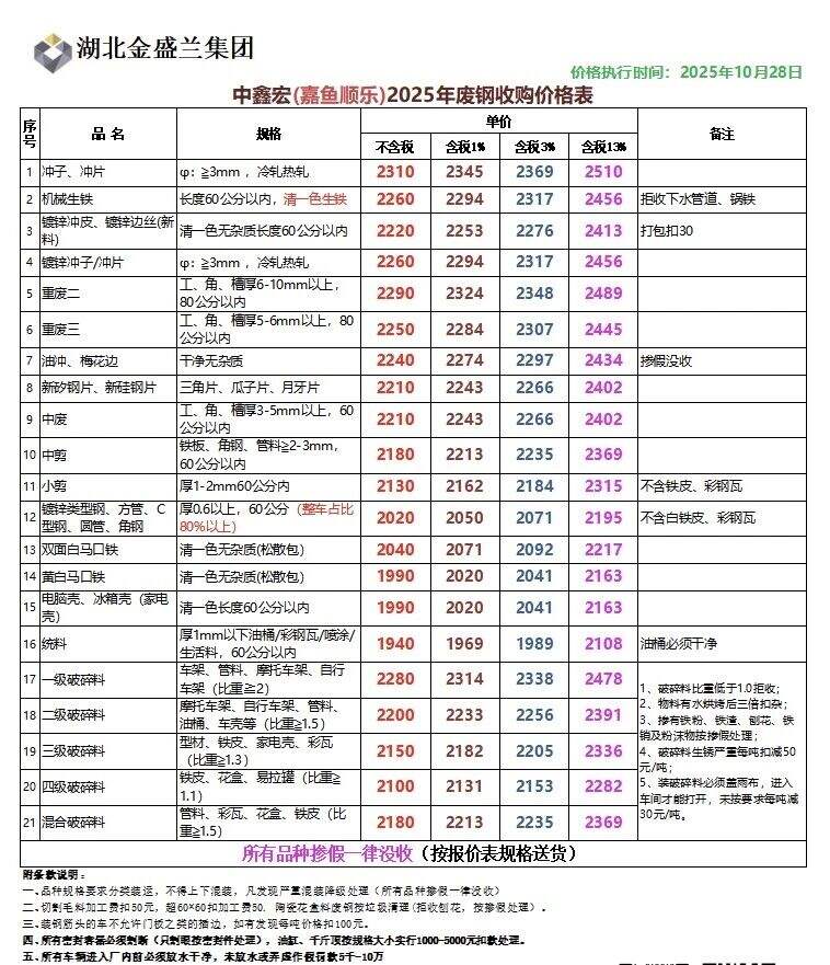 **日嘉鱼顺乐废钢最新价跌**:冲子、冲片****,机生铁****镀锌冲子/冲片****,重废二****中废****,中剪****不含税。
