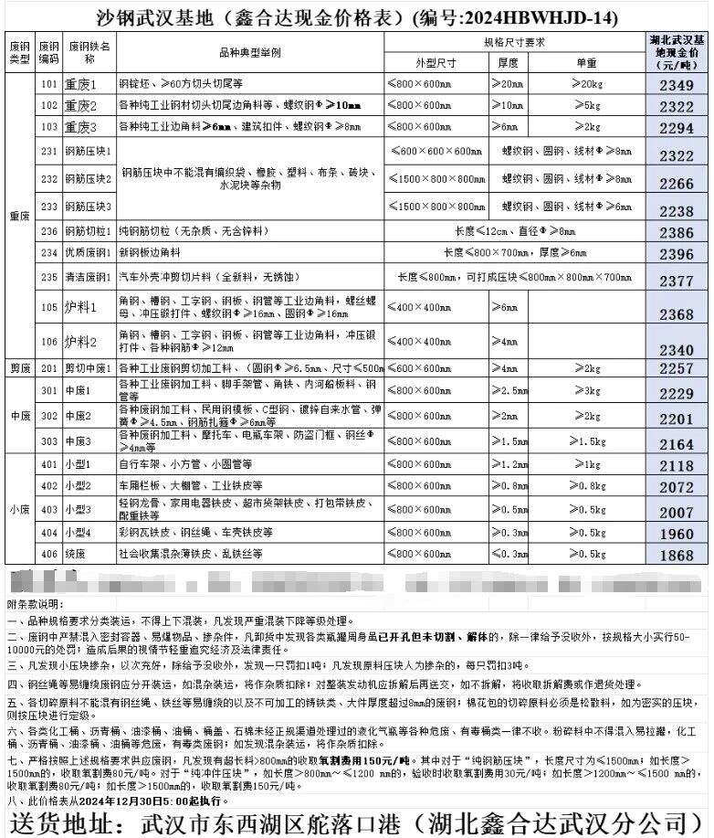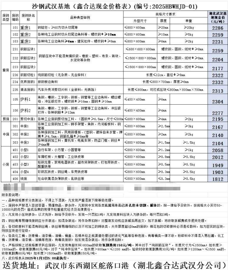 价格表更新!沙钢武汉基地自****年*月*日起废钢含税价格下调**元/吨,具体以价格表为准。
