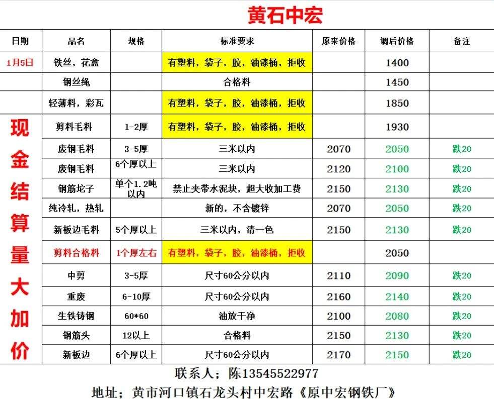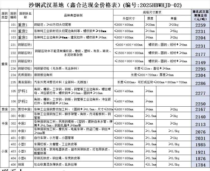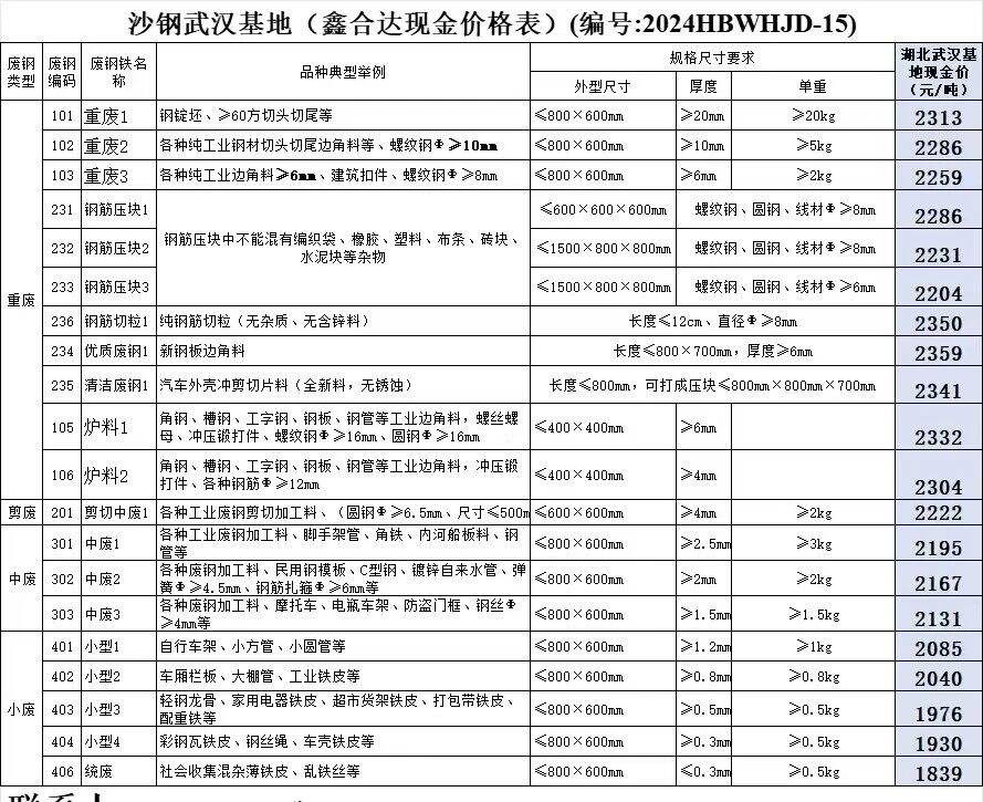 价格表已更新!沙钢武汉基地自****年**月**日起废钢含税价格下调**元/吨,具体以价格表为准。