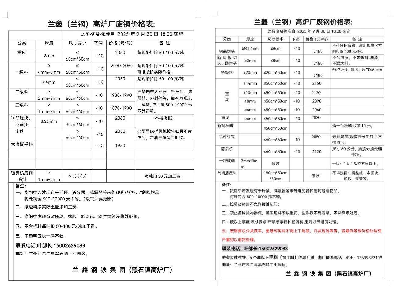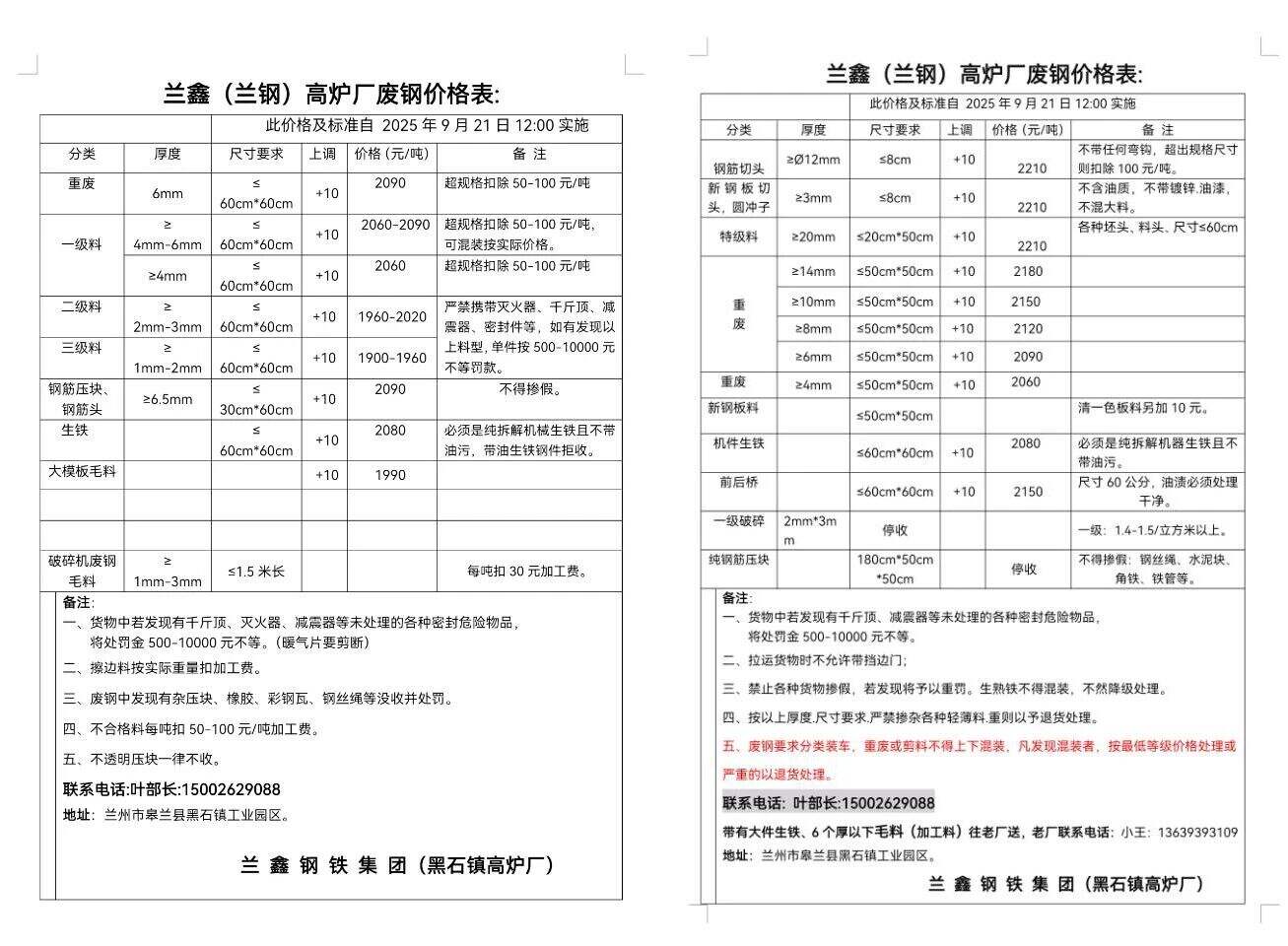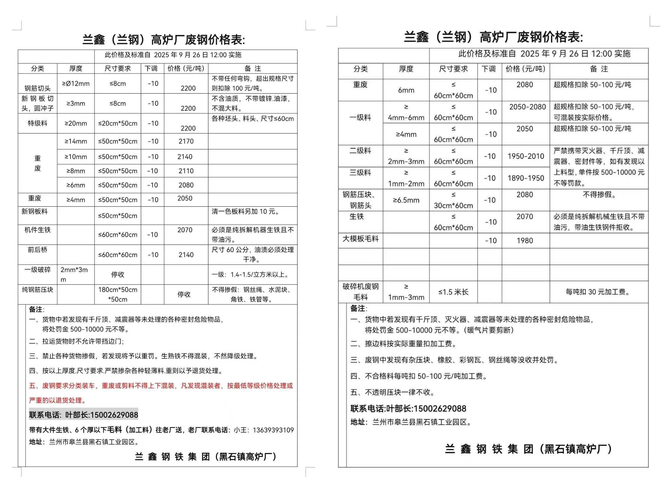 **日兰州兰鑫厂废钢跌**,价格表另发。