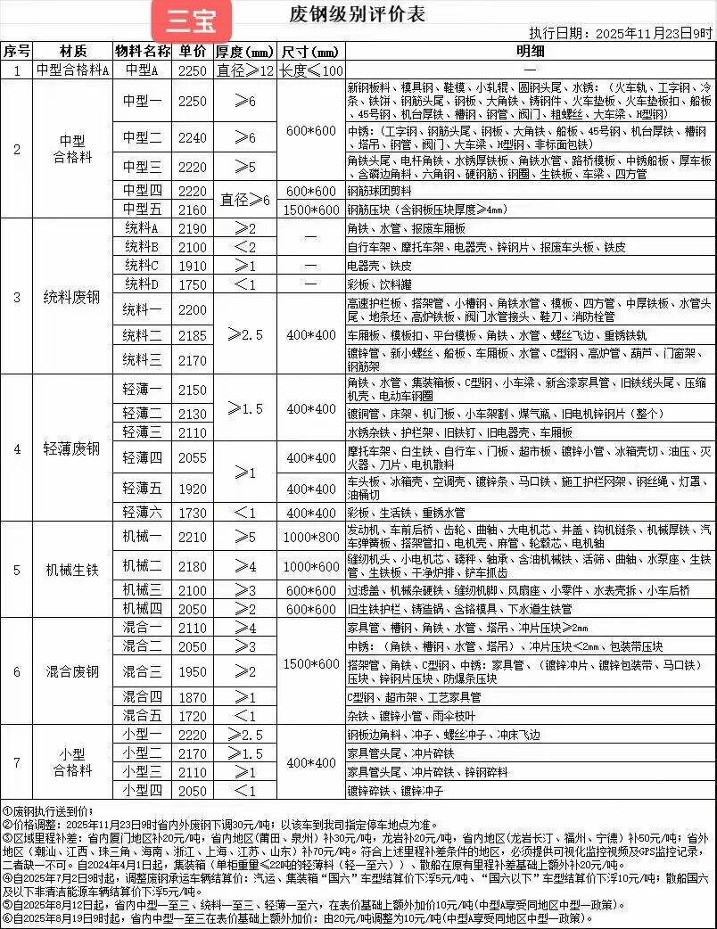 通知尊敬的供应商!****年**月**日*时,福建三宝省内外废钢下调**元/吨,调后重废一基价为****元/吨