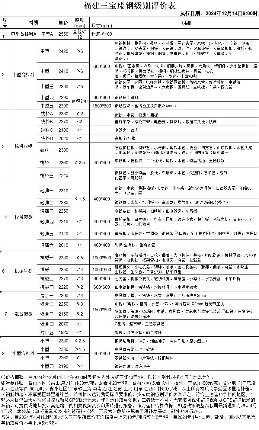 通知尊敬的供应商!****年**月**日*时,福建三宝省内外废钢上调**元/吨,调后重废一基价为****元/吨。