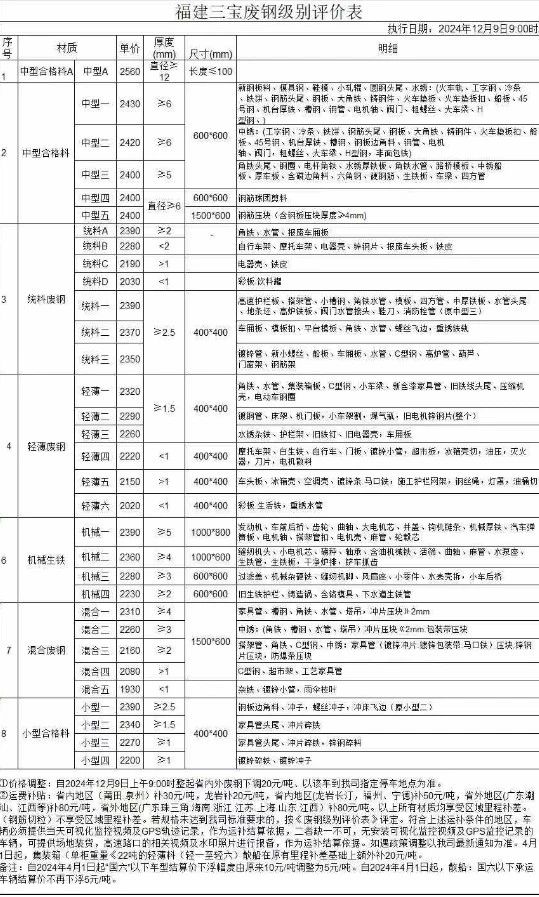 顺昌宏丰通知:废钢刨花破碎料等所有品种统一上调**元/吨,生铁****-****、大件生铁****、优重****、重废****-****、中废****-****、小废****-****、大钢刨****、数控/压块****、普刨****、破碎料****-****
