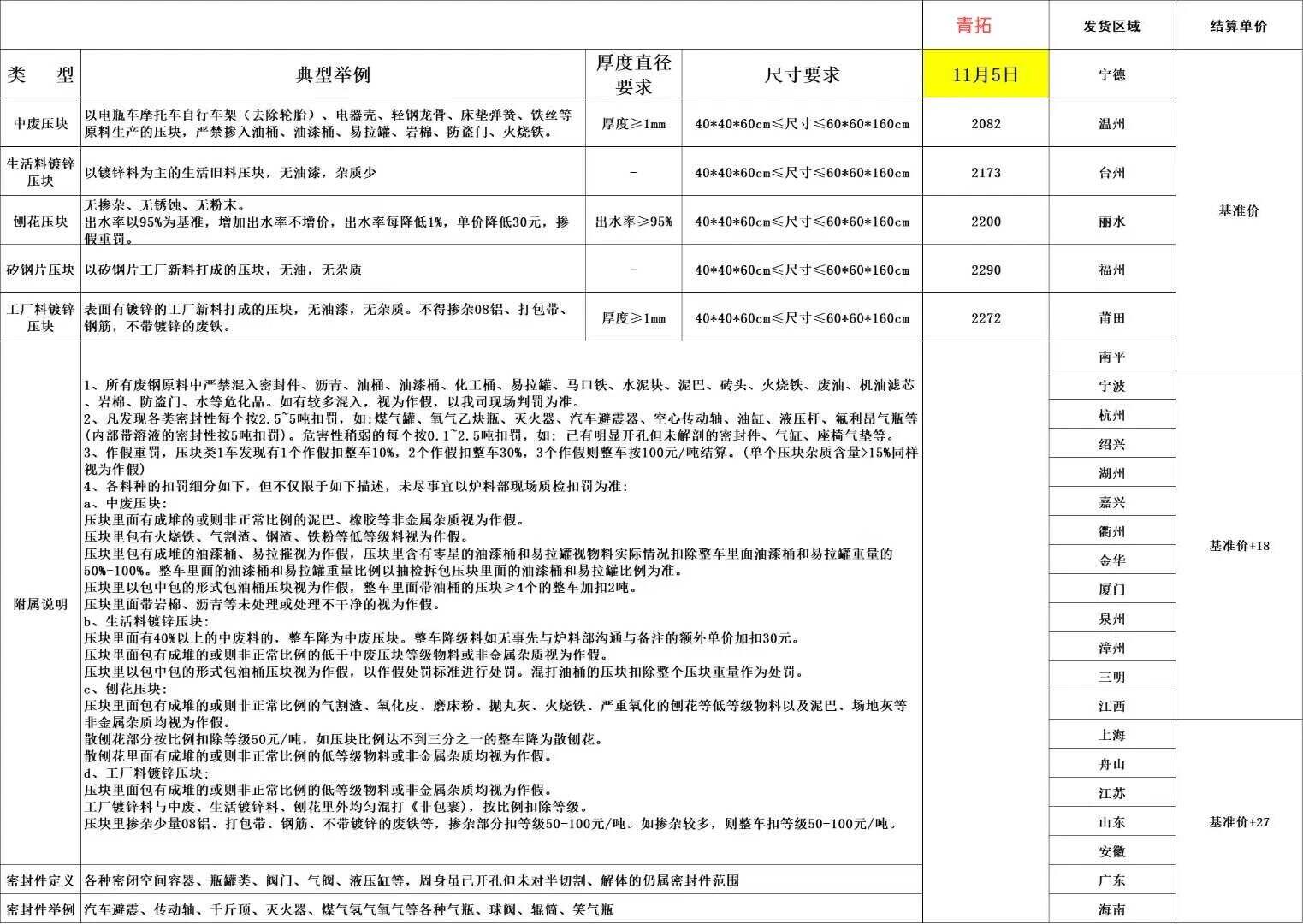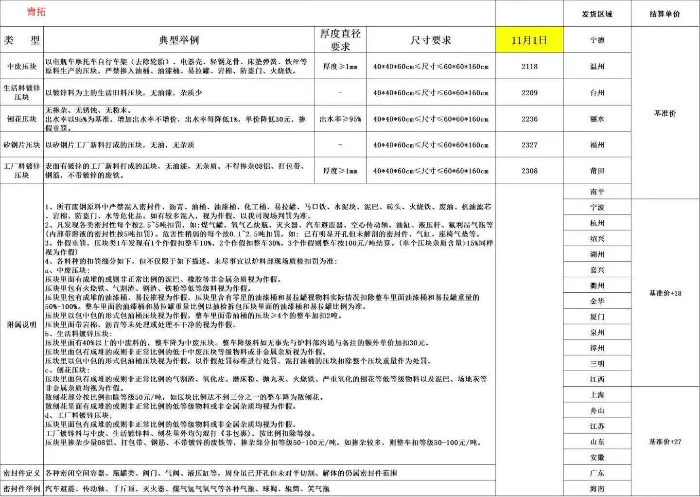 青拓通知:****年**月*日所有料型跌**,具体以价目表为准。