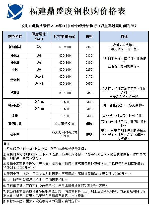 福建龙钢对废钢采购价格下调**元/吨,价格调整从****年**月*日*点开始执行。