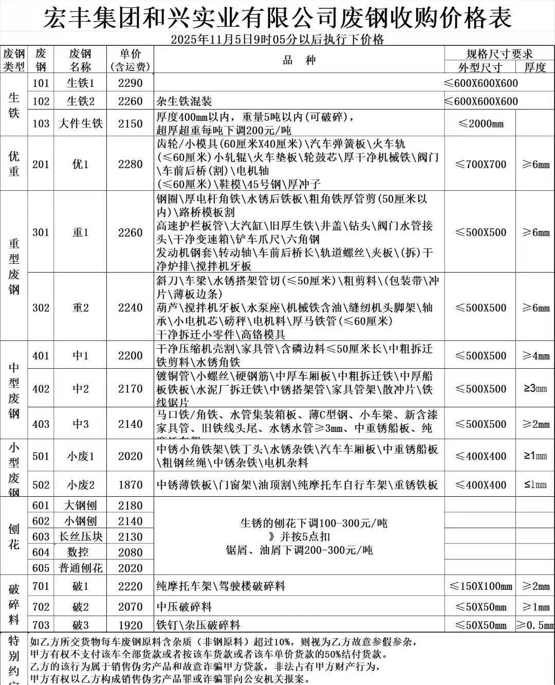 顺昌宏丰通知:废钢刨花破碎料等所有品种统一下调**元/吨,现在起执行。