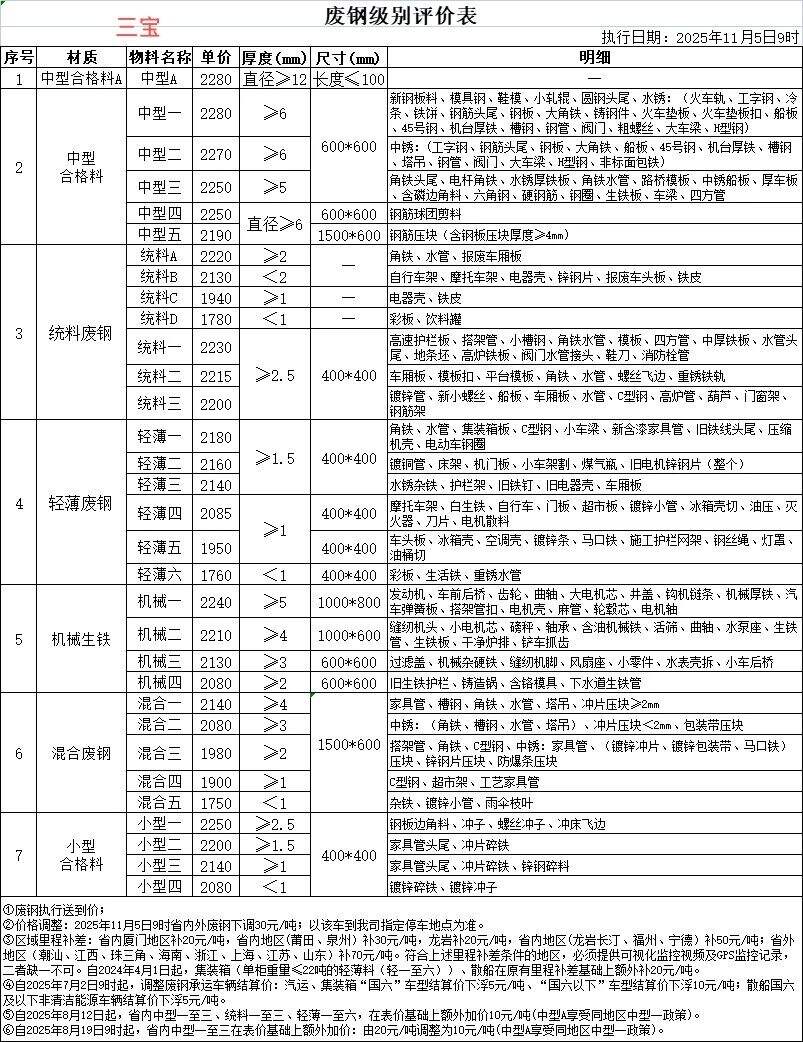 通知尊敬的供应商!****年**月*日*时,福建三宝省内外废钢下调**元/吨,调后重废一基价为****元/吨。