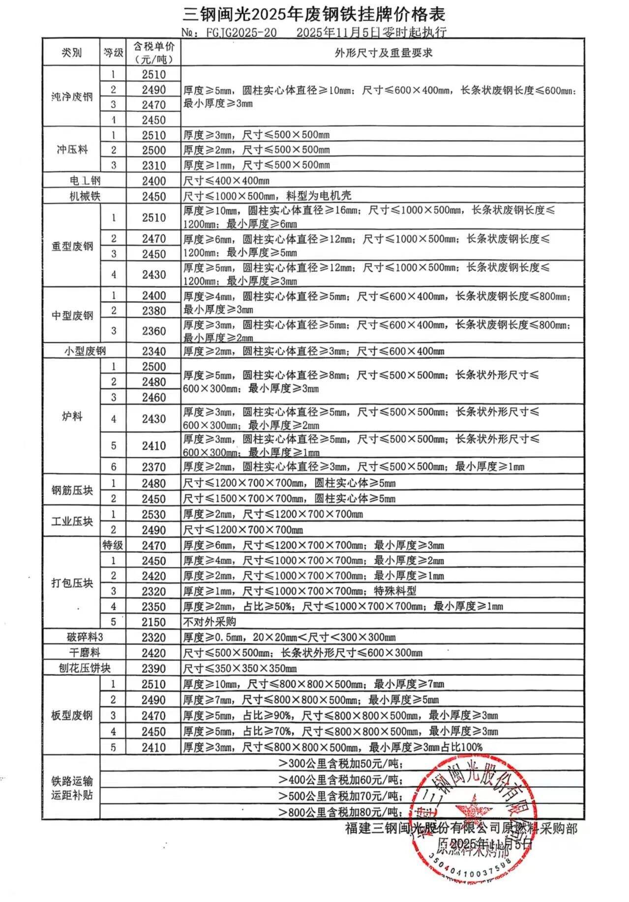 福建三钢:****年**月*日零时起,省内外所有等级废钢含税下调**元/吨。具体详见价格表。