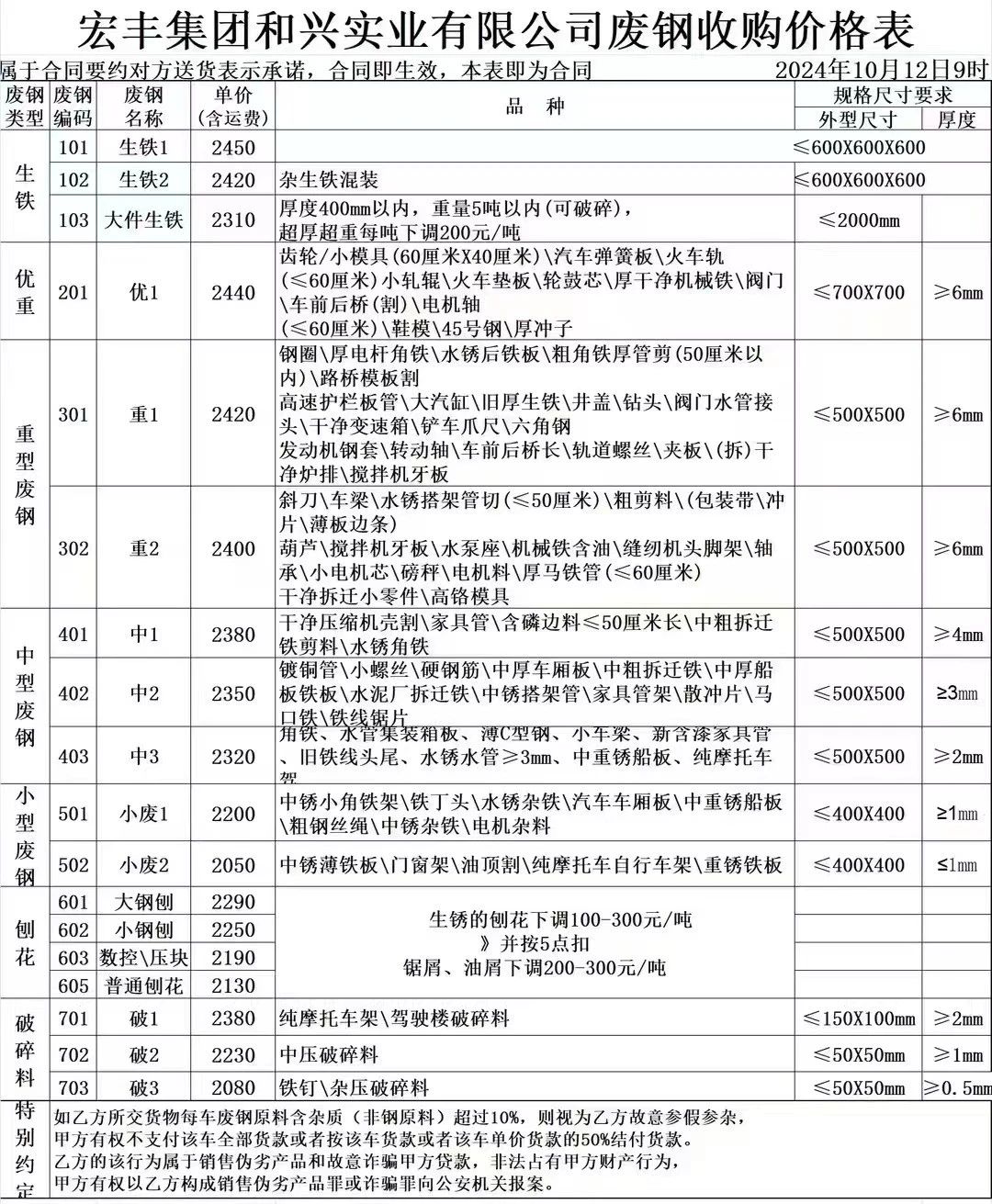 顺昌宏丰通知,废钢刨花破碎料等所有品种统一下调**元/吨,生铁****-****、大件生铁****、优重****、重废****-****、中废****-****、小废****-****、大钢刨****、数控/压块****、普刨****、破碎料****-****