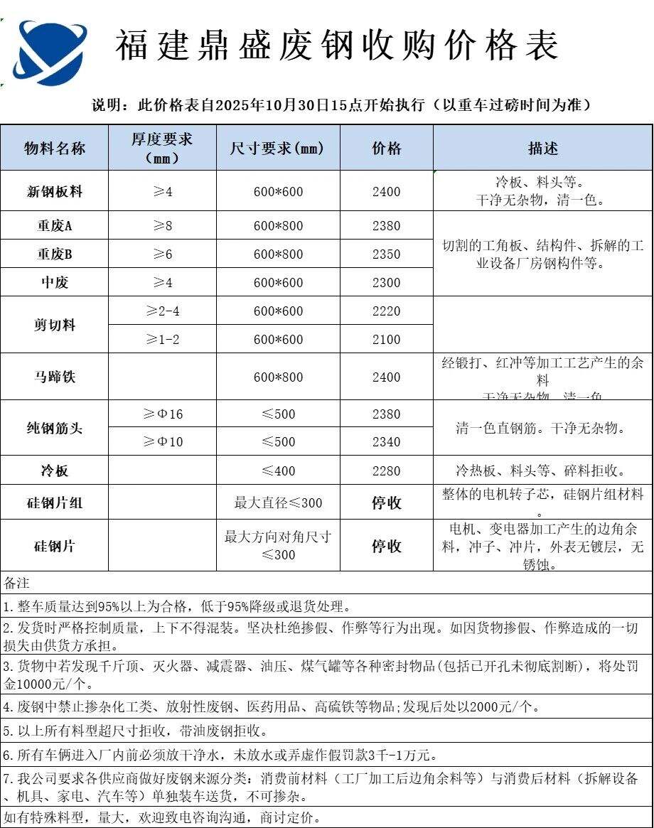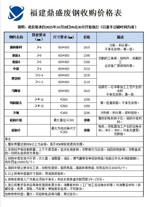 **月*日福建鼎盛废钢降**元/吨,新钢板料****重A****重B****中废****马蹄铁****剪切料****-****,纯钢筋头****-****,冷板****,硅钢片组、硅钢片停收。