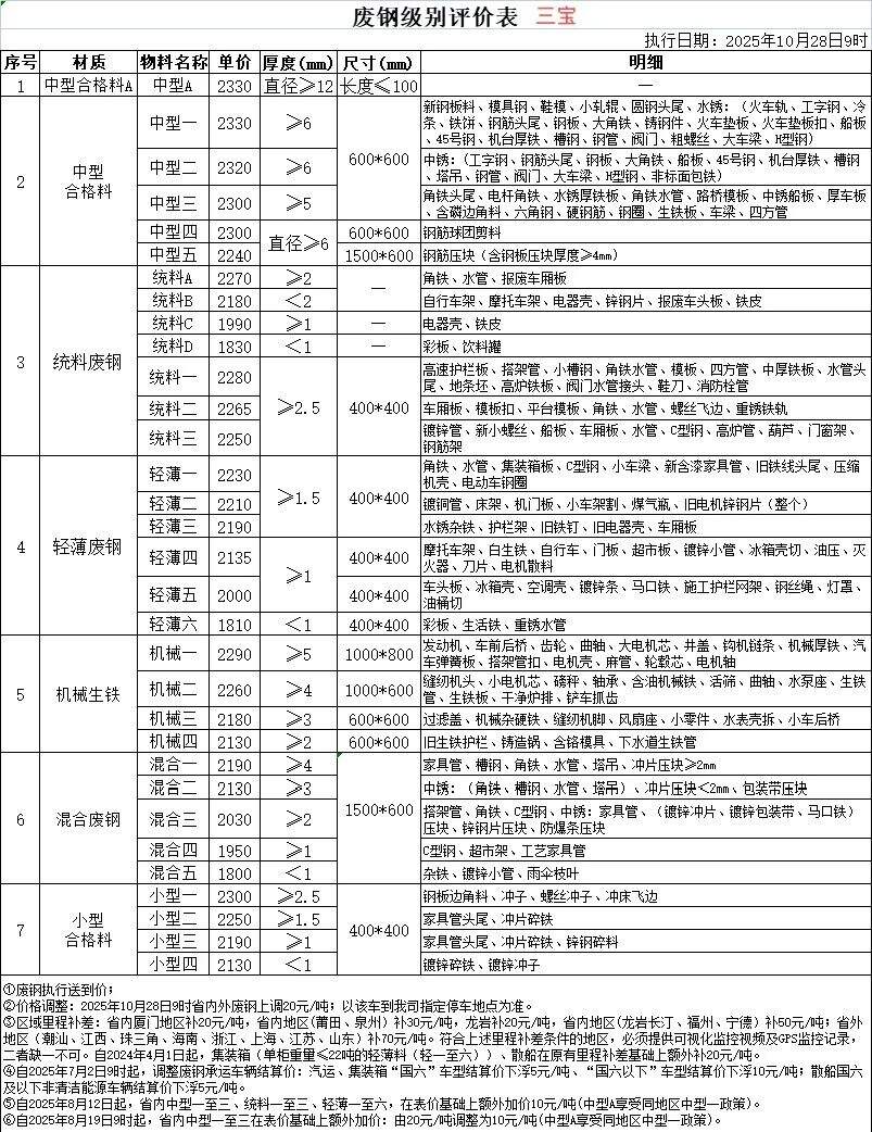 通知尊敬的供应商!****年**月**日*时,福建三宝省内外废钢上调**元/吨,调后重废一基价为****元/吨。