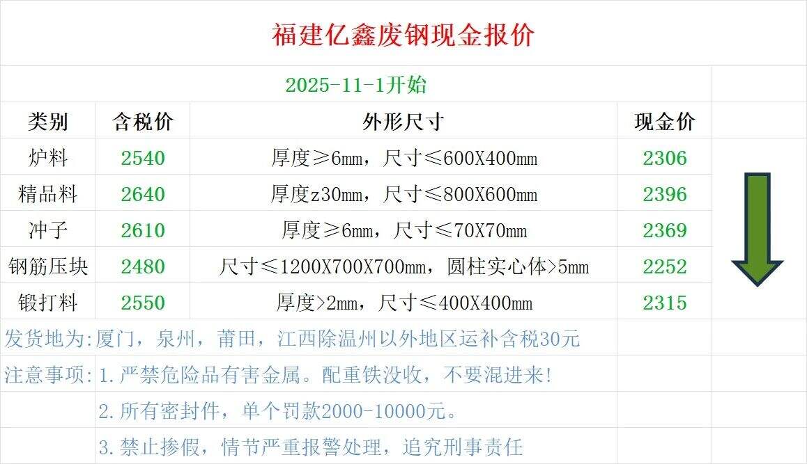顺昌宏丰通知:废钢刨花破碎料等所有品种统一下调**元/吨,现在起执行。