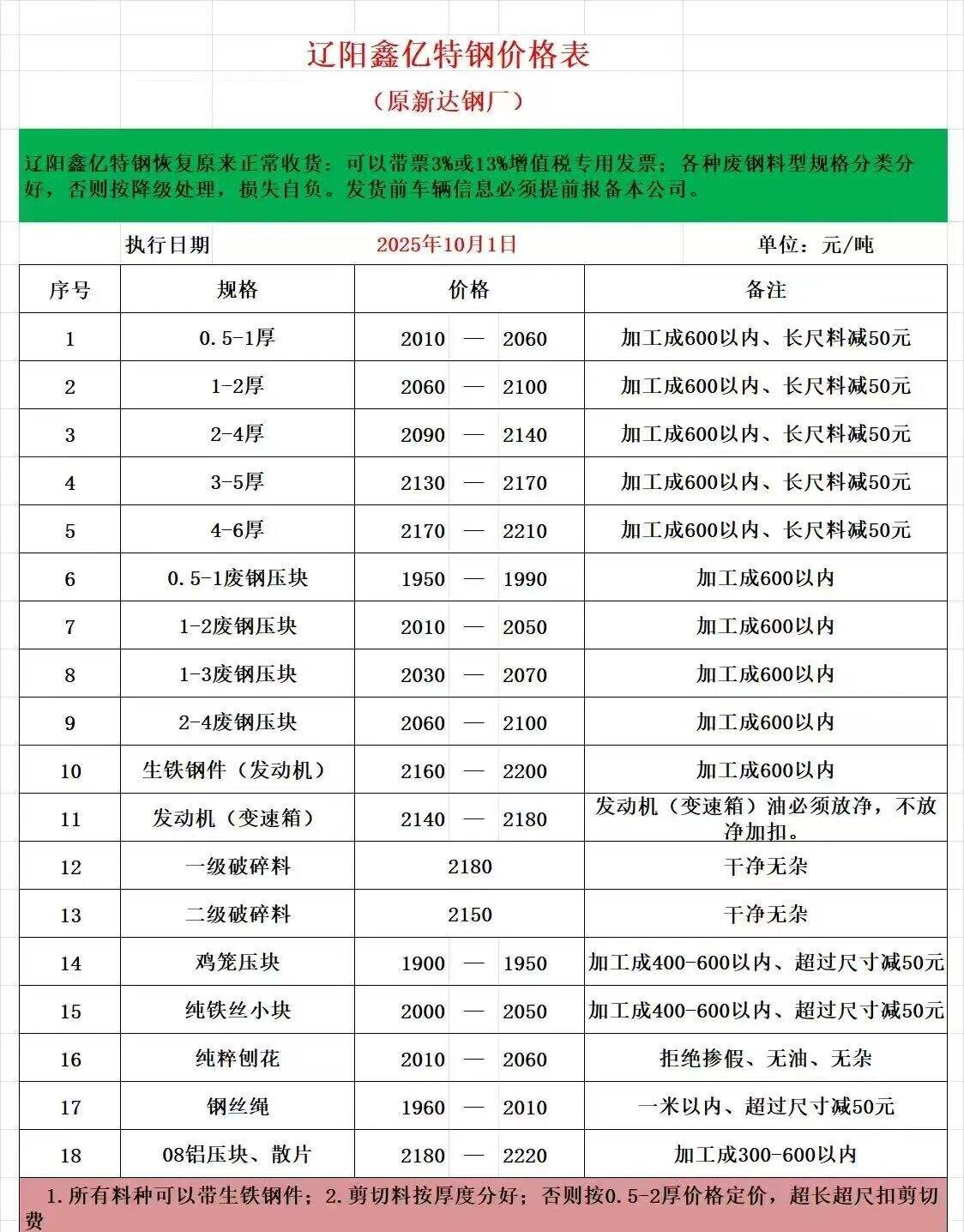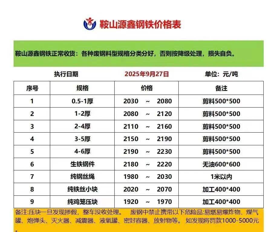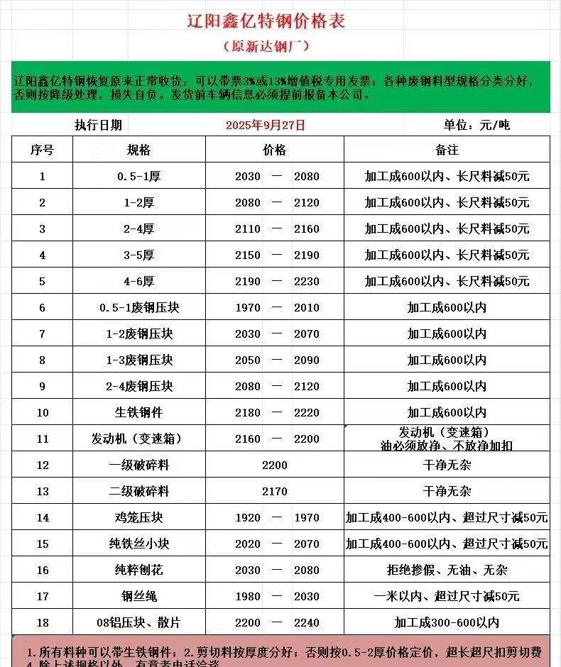 敬业营口中板**月**日*时开始执行最新价格,*厚以上废钢****,*厚废钢****,*-*厚废钢****废钢压块*厚****,废钢压块*厚****,钢筋压块*.*米****,架子管压块*厚****,花铁压块*.*厚****花铁压块*厚****,汽车板压块****破碎料比重*.*以上****破碎料比重*.*以上破碎料压饼****严禁:镀锌,油件,封闭物。