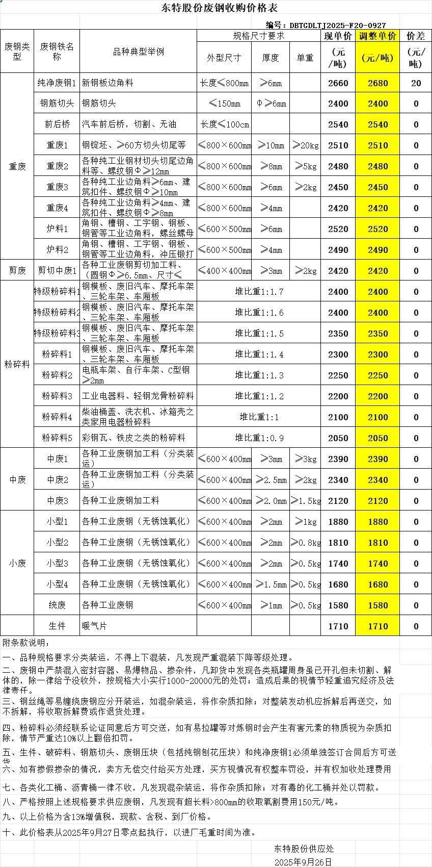 东特股份于****年*月**日零点调整采购价格纯净废钢上调**,纯净废钢一****,重一****,重二****重三****,重四****,炉料一****炉料二****剪中****中废一****特级粉碎一****粉碎一****小型一****含税。