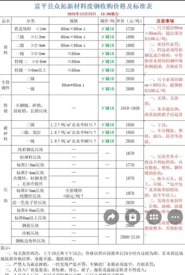 ****年**月**日陕西富平县众拓新材料制造有限公司废钢收购价格下调**-**元