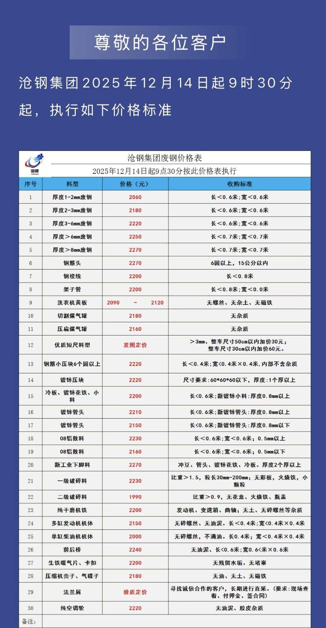沧钢通知:****年**月**日*:**起废钢价格上调**元。
