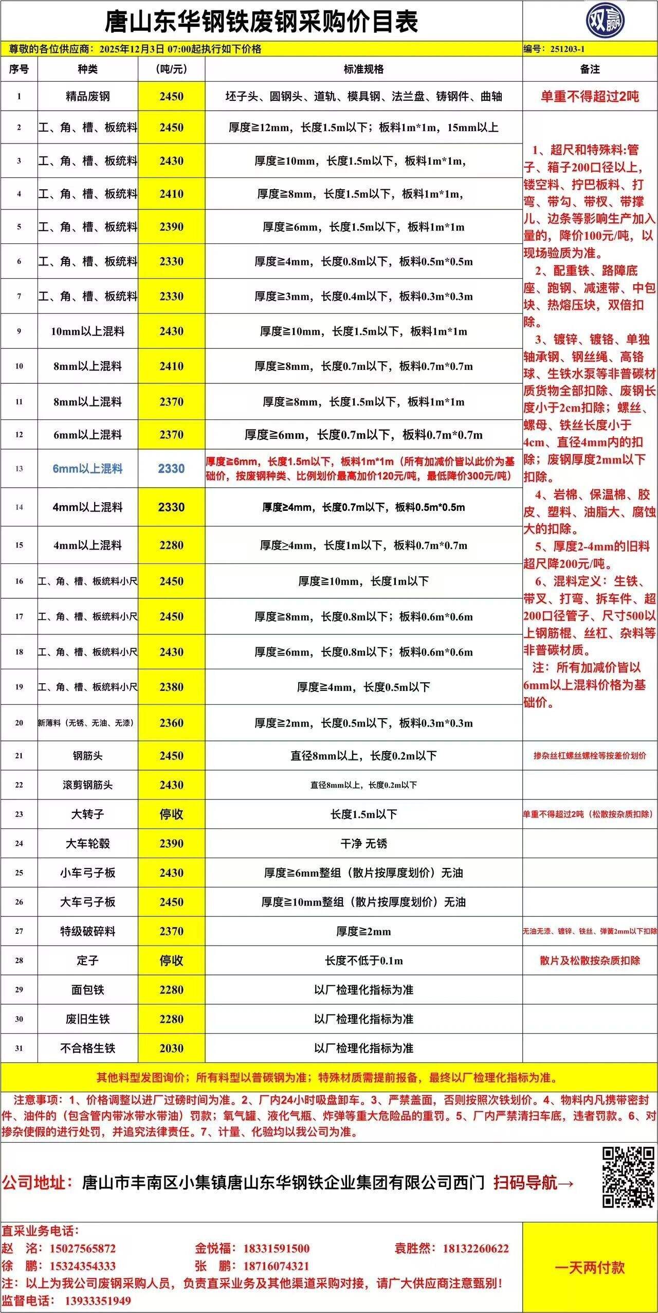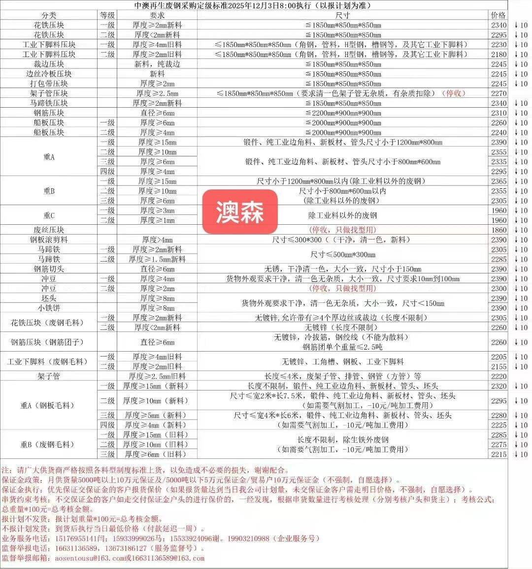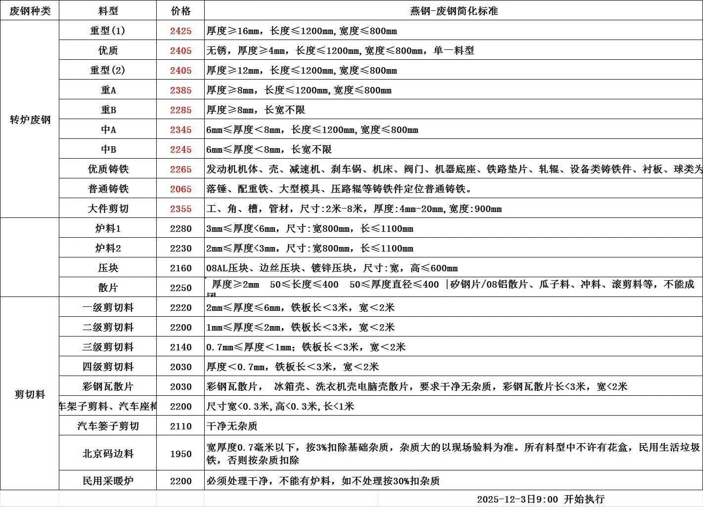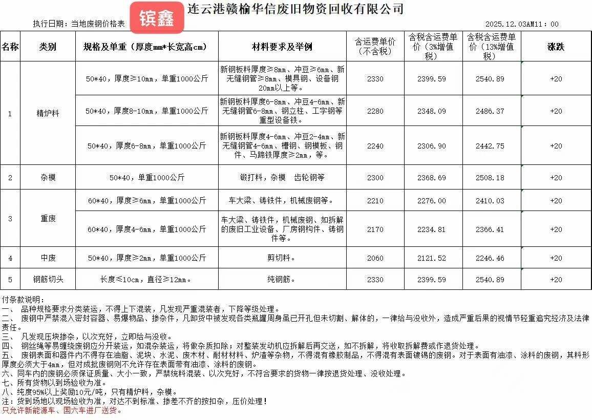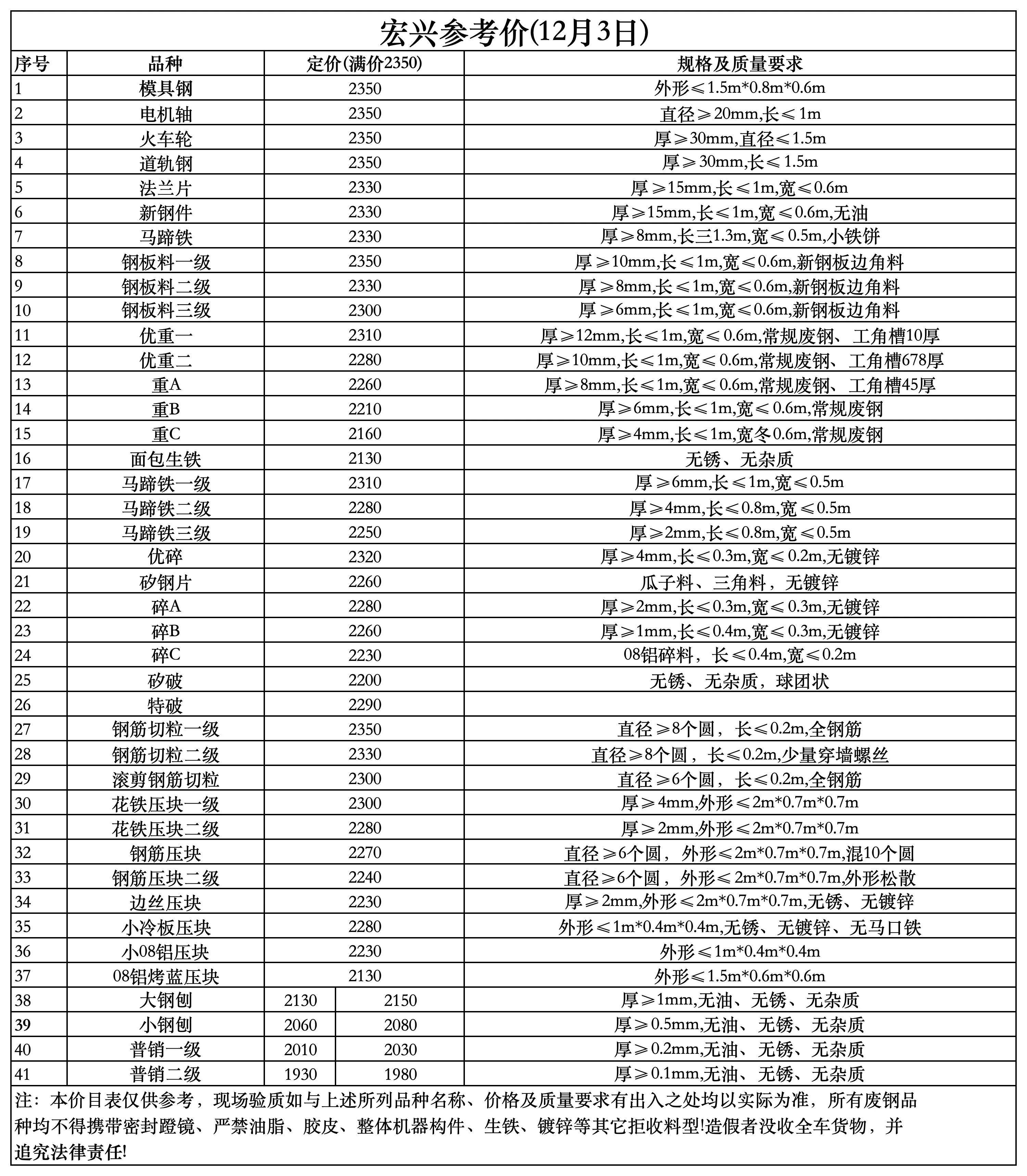 连云港亚新通知:**月*日废钢价格上调**元/吨:一、**毫米厚新钢板料,模具钢,价****元;二、*毫米厚度以上锻打毛边,价****-****元;三、重废A,价****元;四、*毫米厚重废B,价****元;五、*毫米厚中废新料,价****-****元。*毫米厚度以下拒收,车面与车底等级不一,按掺假处理。规格:**X**。超长度需重新加工:(*)占**%以上扣**元/吨(*)占**%以上扣***元/吨(*)化工厂料,带油料,高硫废钢,油漆桶废钢一律拒收。所有密封容器(如:千斤顶,汽车液压顶,各类气瓶,罐,密封管件等),必须彻底切断处理,如未彻底切断,重罚*****元以上/件。