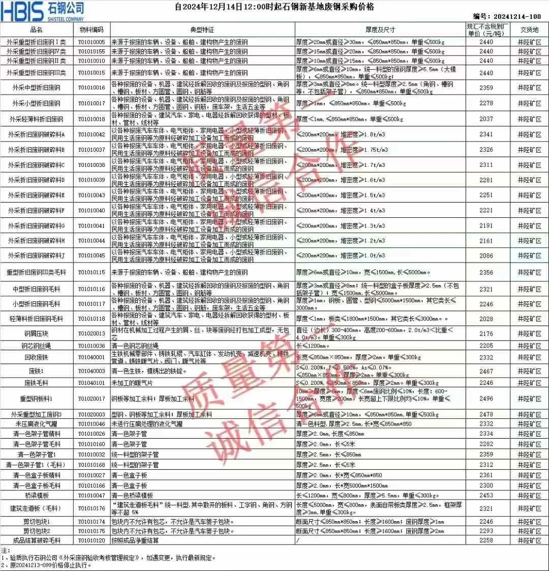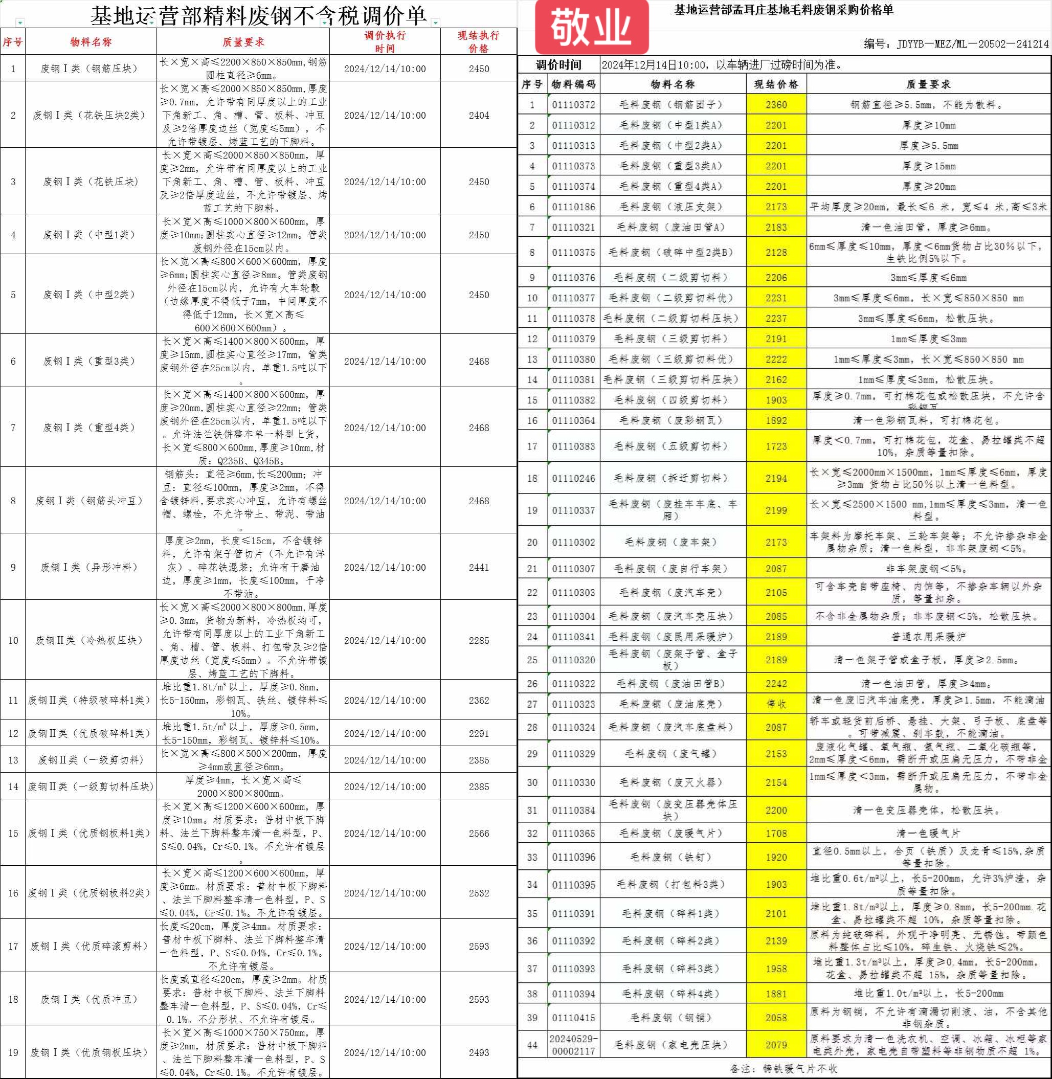 唐银**月**日**点**执行钢筋头****(剪切、混剪)冲豆/花铁****(*厚以上)钢板料****(**厚以上)钢板料二级****(*厚以上干净)优质****(**厚干净废钢)门剪一级****(*-*工角槽)门剪二级****(*-*工角槽,含大模板干净)重废一级****(*-*禁镀锌)重废二级****(*-*禁镀锌)注意:车型国六车跟电车盖好苫布或网布,注意质量发现掺假,整车罚没同时追究罚款处理!注意:带水箱的车进厂前必须水放干净!