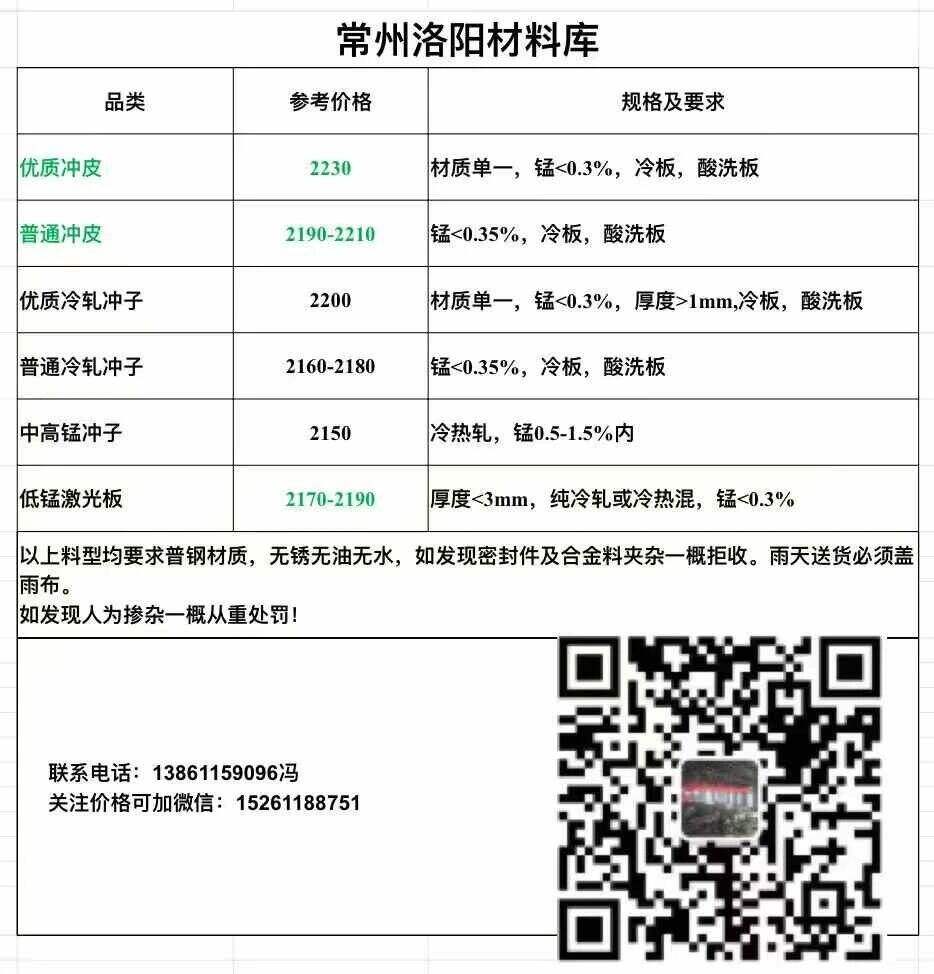 常州洛阳材料库高价收购、自提冷板冲皮,钢板料。收购价:优质冷板酸洗冲条冲皮最高****,普通低锰冷板酸洗冲条冲皮****-****,低碳低锰冲子****-****,中高锰冷热冲子****,低锰激光板****-****,联系电话***********冯,关注最新价格请加微信:***********。地址:江苏常州武进洛阳镇创盛路*号