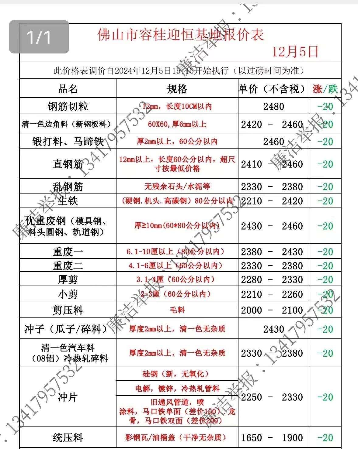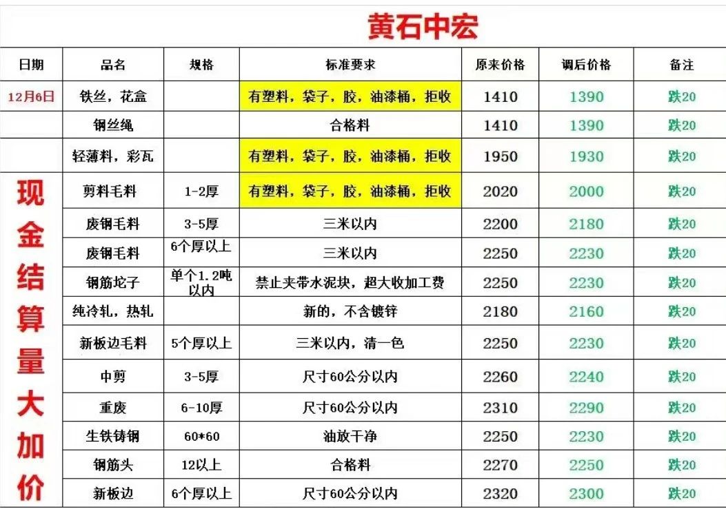 唐山古冶区华赢基地废钢采购通知:****年**月*日**:**起,整体下调**元,可镀锌混装,详见价目表。欢迎新老客户洽谈、合作!