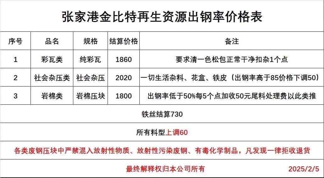 ****年*月*日张家港金比特再生资源出钢率价格表 涨**