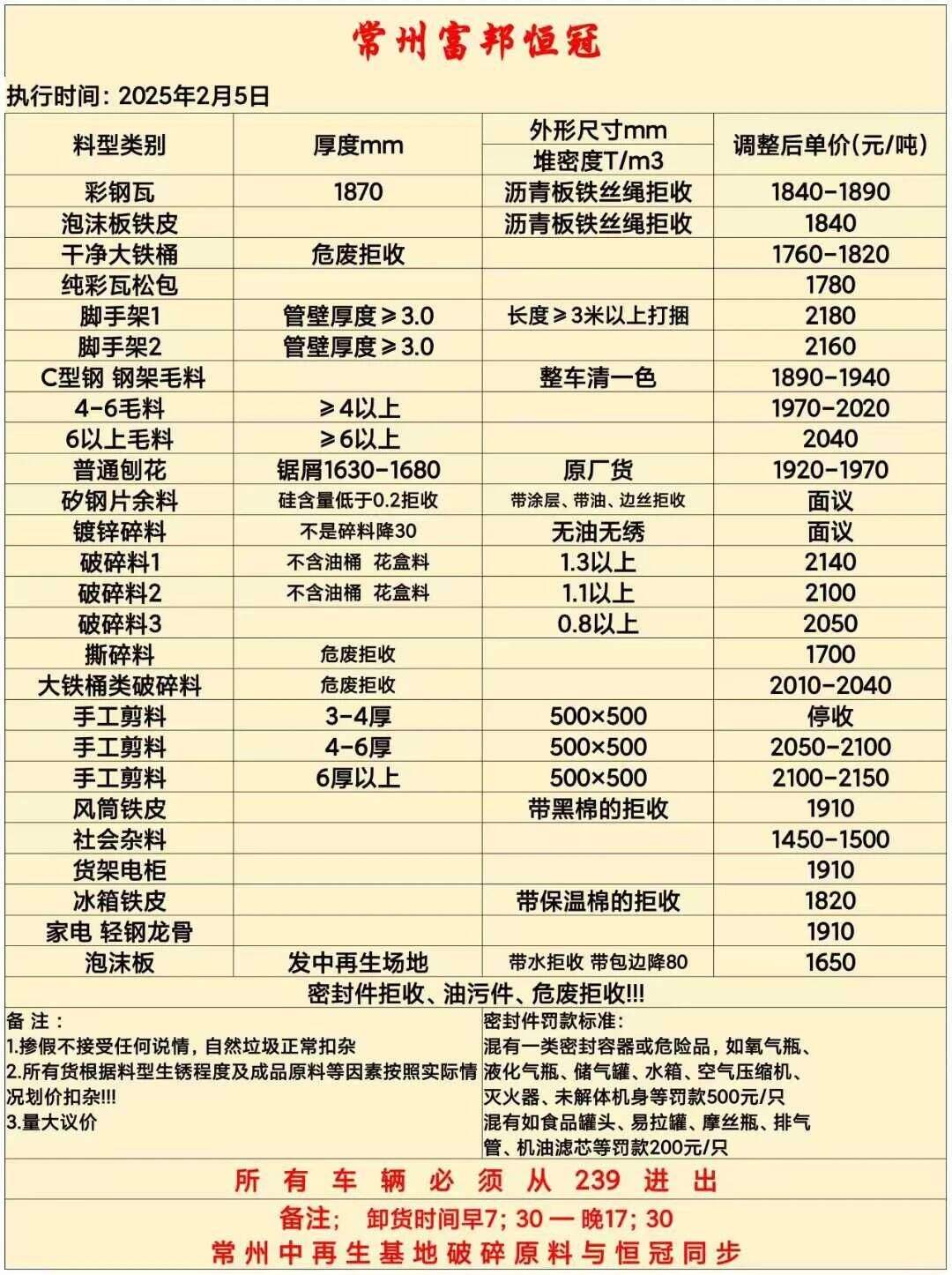 二:≥*mm工业优重(工槽钢、大角铁、钢立柱,钢模板等清一色料型)****~****,≥*mm重废****~****,生铁油污件****,≥*mm中废,含镀锌料****~****,以上品种合格料型➕**(大件类汽割料型价格表减**~***元);