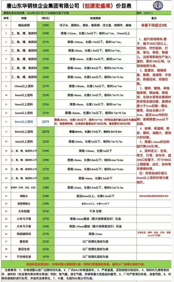 2026年4月27日唐山东华钢铁企业集团有限公司(创源宏盛库)价目表