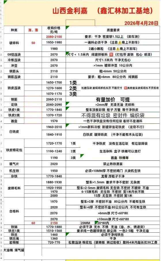 2026年4月28日山西金利嘉(鑫汇林加工基地)报价