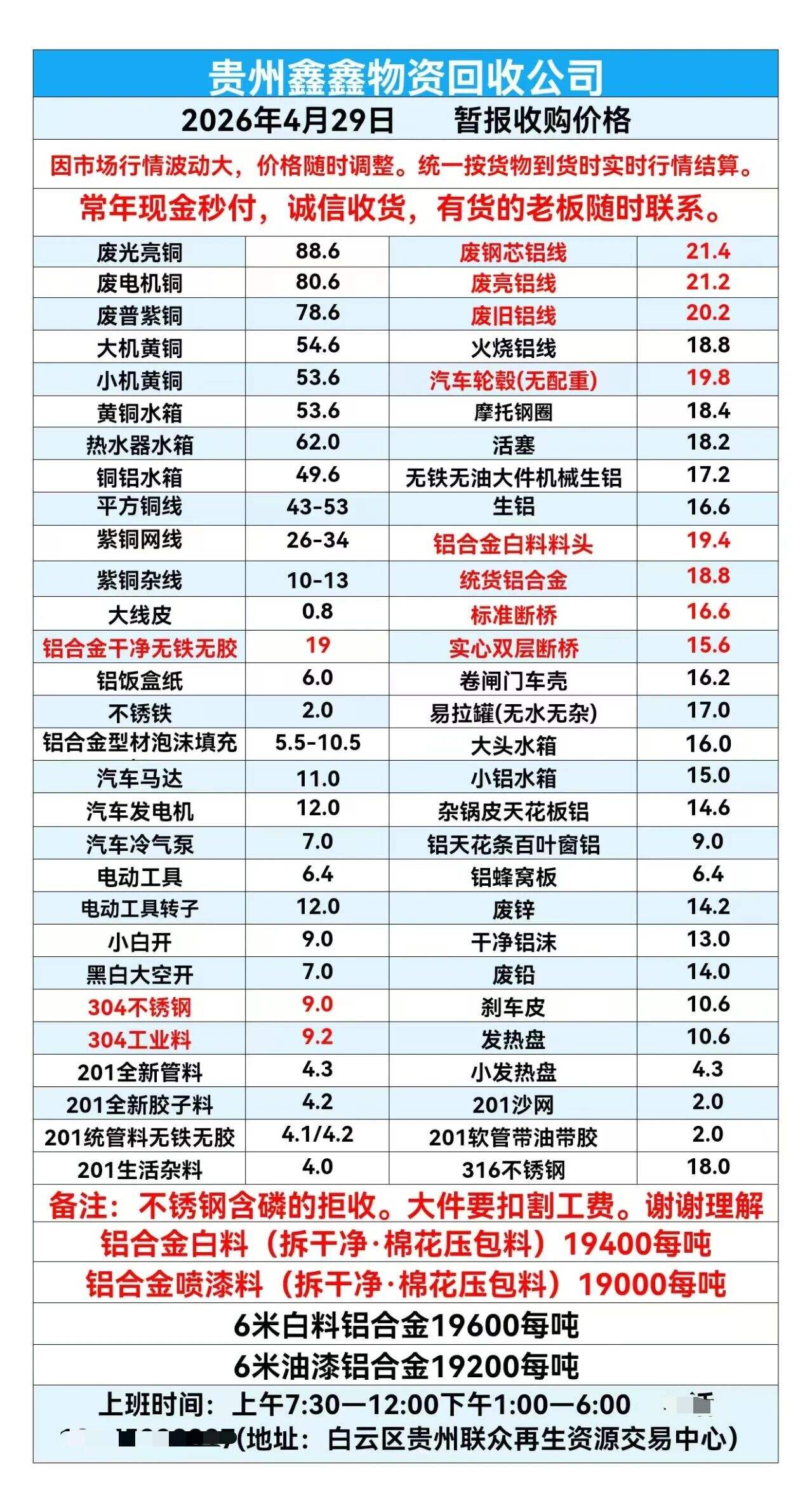 2026年4月29日贵州鑫鑫物资回收公司报价